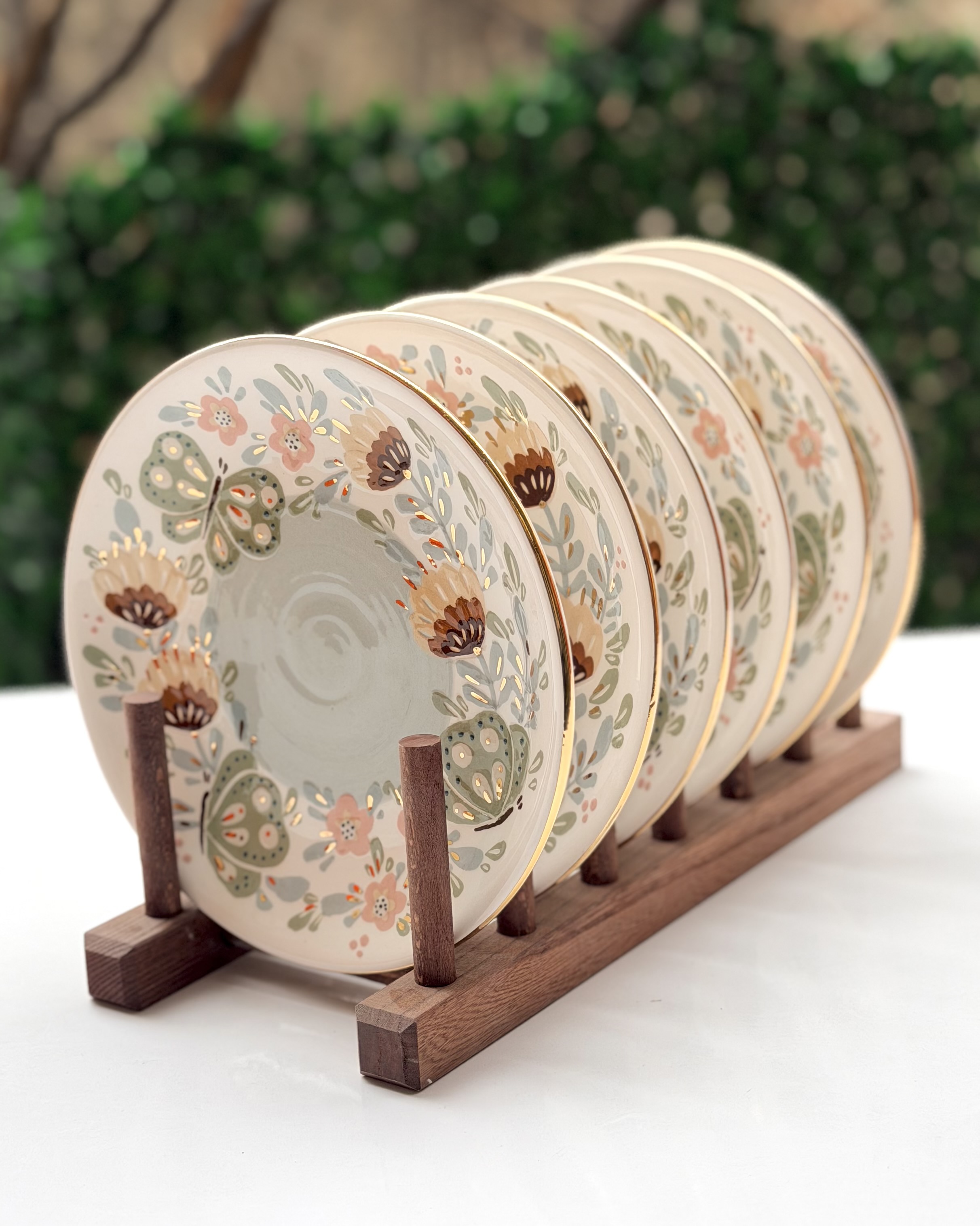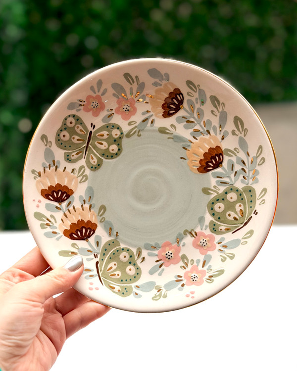 طرح پروانه یشمی یکی از خوشرنگ ترین و زیباترین طرح های کارگاه پرساز هست. پیشدستی ها تماما در کارگاه پرساز ساخته شده و با دست نقاشی میشن، سه مرحله در کوره با دمای بالا پخته میشن، چیزی که خیلی خاصشون میکنه اینه که با طلای ۲۴ عیار تزیین شدن. لعاب دارن و قابل شست و شو هستن.