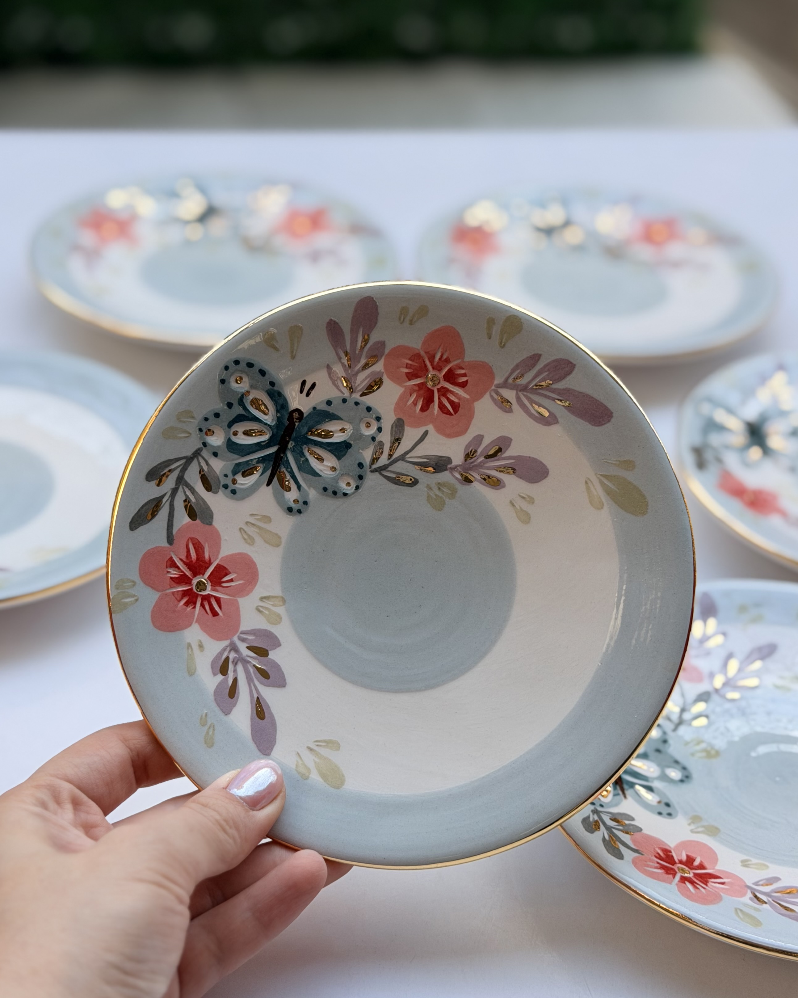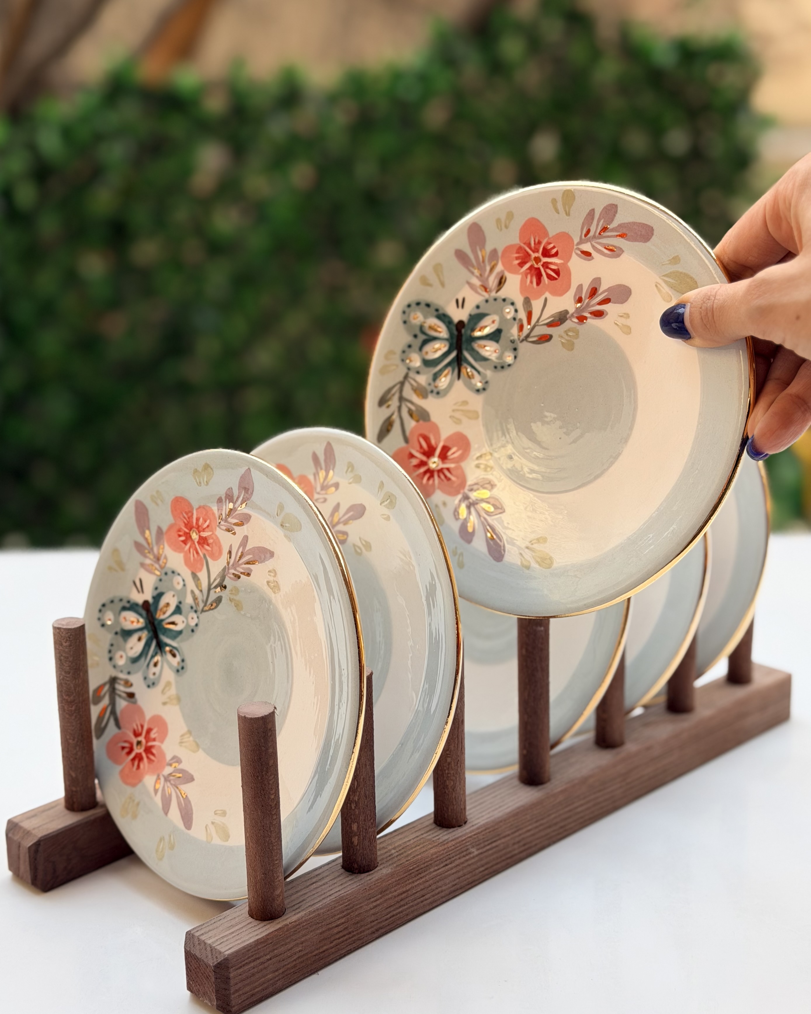 پیشدستی طرح پروانه سبز و گل صورتی قطر ۱۵
